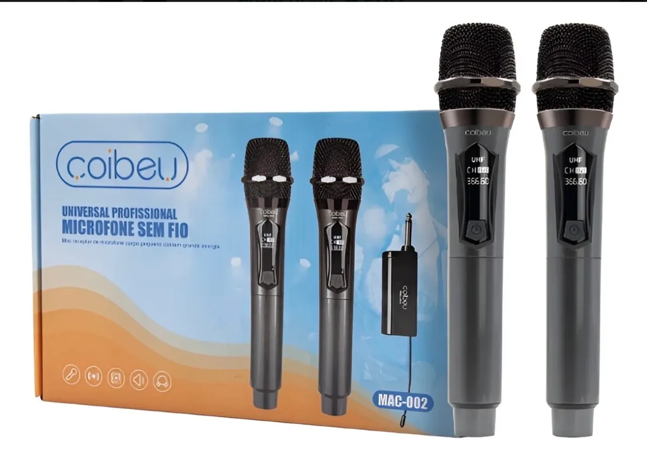 Microfone sem fio profissional Coibeu, ideal para diversas aplicações. Desfrute de áudio de alta qualidade e liberdade de movimento. Perfeito para shows, palestras e eventos.