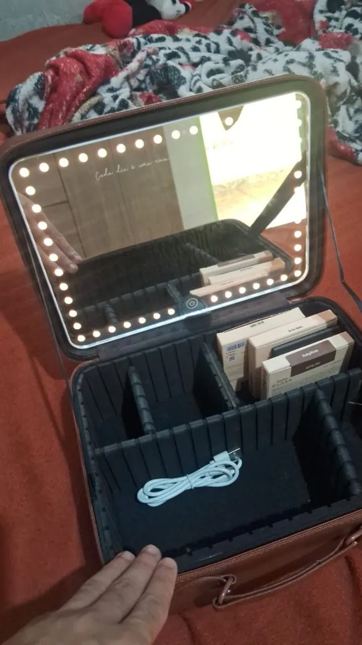 Linda maleta de maquiagem com espelho e iluminação embutida. Ideal para organizar e transportar seus produtos de beleza com praticidade e estilo!