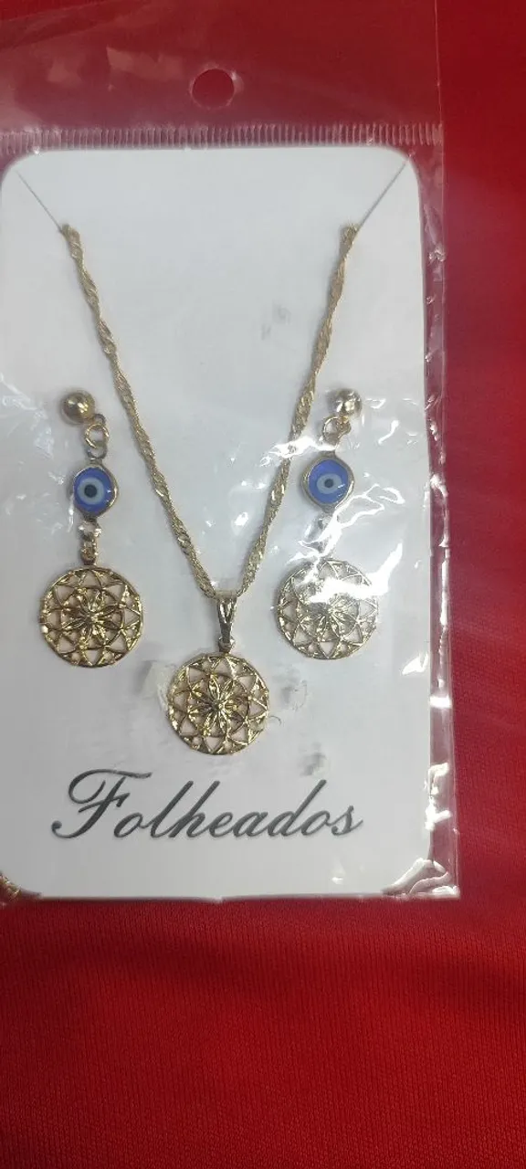 Lindo conjunto folheado a ouro, perfeito para realçar sua beleza e estilo. Com design elegante e detalhes únicos, este conjunto é a escolha ideal para diversas ocasiões.
