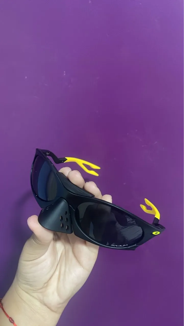 Óculos Oakley com design esportivo, lentes escuras e detalhes em amarelo. Perfeitos para atividades ao ar livre.