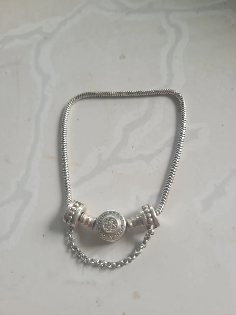 Linda pulseira Pandora de prata, perfeita para adicionar um toque de elegância ao seu visual. Design sofisticado e atemporal, ideal para complementar qualquer look.