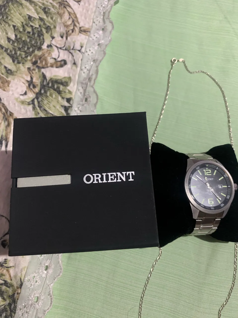 Conjunto elegante! Relógio Orient com design sofisticado e cordão de prata, ideal para complementar seu visual com um toque de classe.