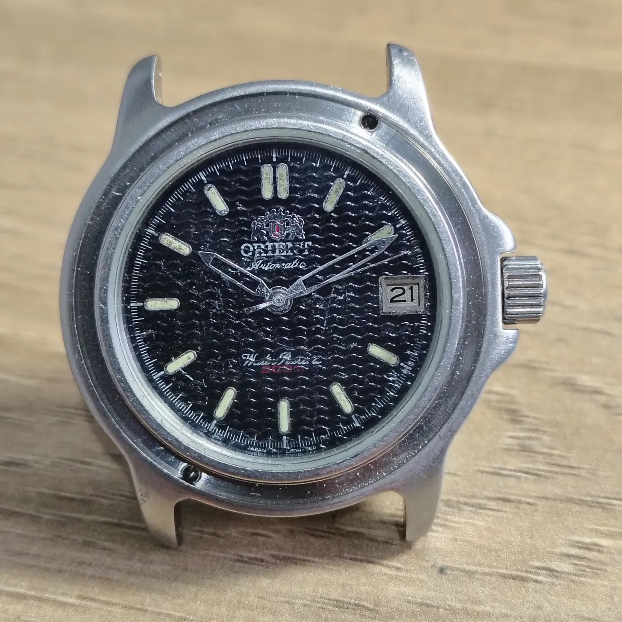 Relógio Orient automático, original, com mostrador preto texturizado e índices luminescentes. Não possui bisel e o lume dos ponteiros não está presente. Caixa em aço inoxidável com marcas de uso compatíveis com a idade. Calendário com data às 3h. Movimento automático (não usa bateria). Frete Sedex
