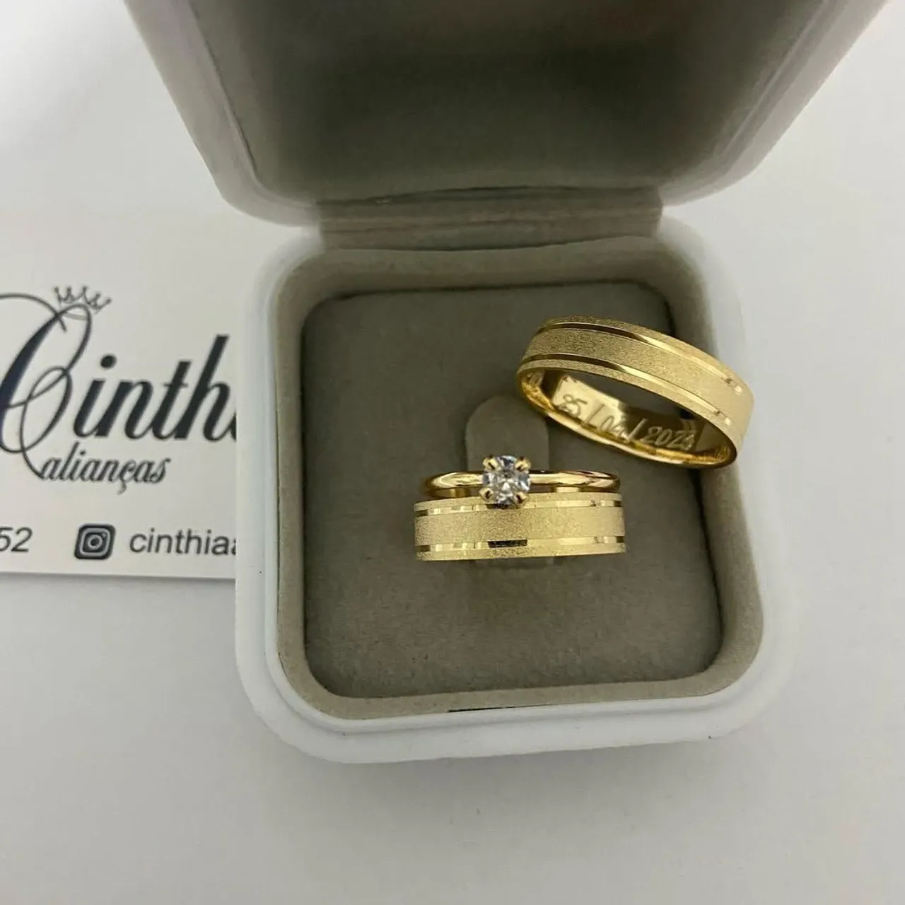 Celebre o amor com este trio de alianças deslumbrante. Um conjunto perfeito para simbolizar a união e o compromisso, com design elegante e detalhes que encantam.