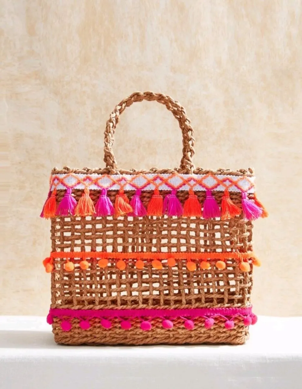 Linda bolsa de palha com detalhes vibrantes em tons de rosa e laranja. Perfeita para um visual charmoso e cheio de estilo.