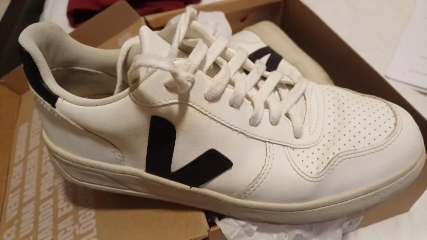 Tênis Veja branco, com o icônico logo em preto na lateral. Conforto e estilo para o seu dia a dia.