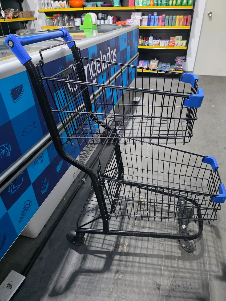 Carrinho de supermercado resistente e espaçoso para facilitar suas compras. Ideal para otimizar o transporte de produtos em seu estabelecimento comercial.