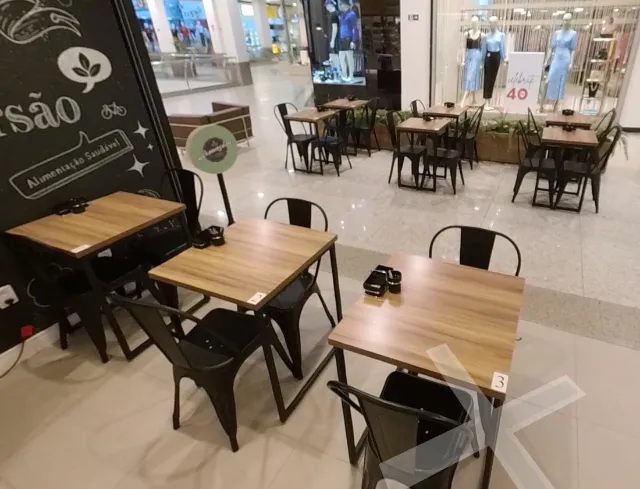 Conjunto de mesas com tampo de madeira e cadeiras de ferro super resistentes. Ideal para restaurantes, lanchonetes e bares. Perfeito para criar um ambiente agradável e convidativo.