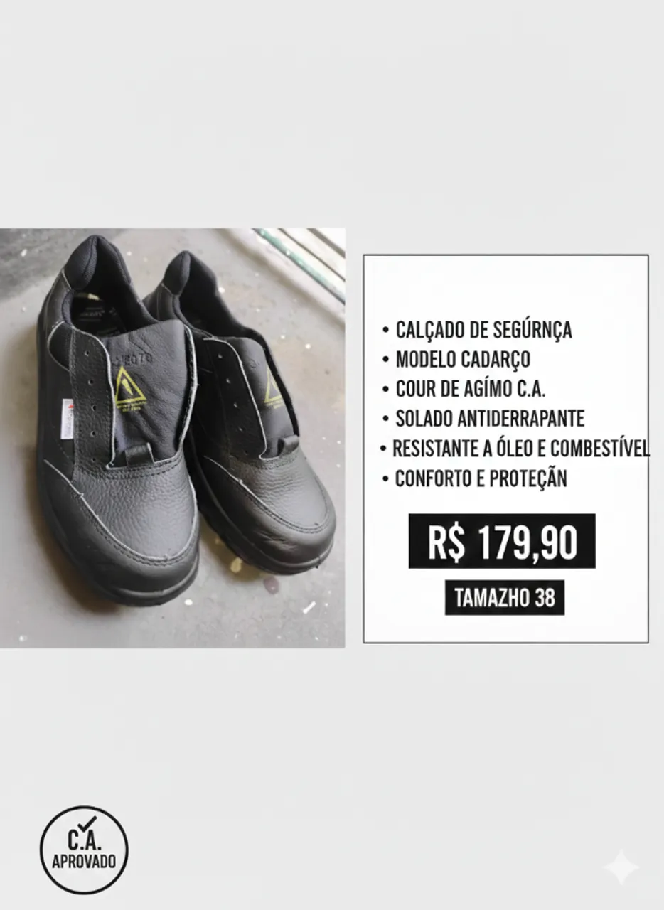 Botina de segurança com cadarço, solado antiderrapante e resistente a óleo e combustível. Conforto e proteção para o seu dia a dia. Tamanho 38
