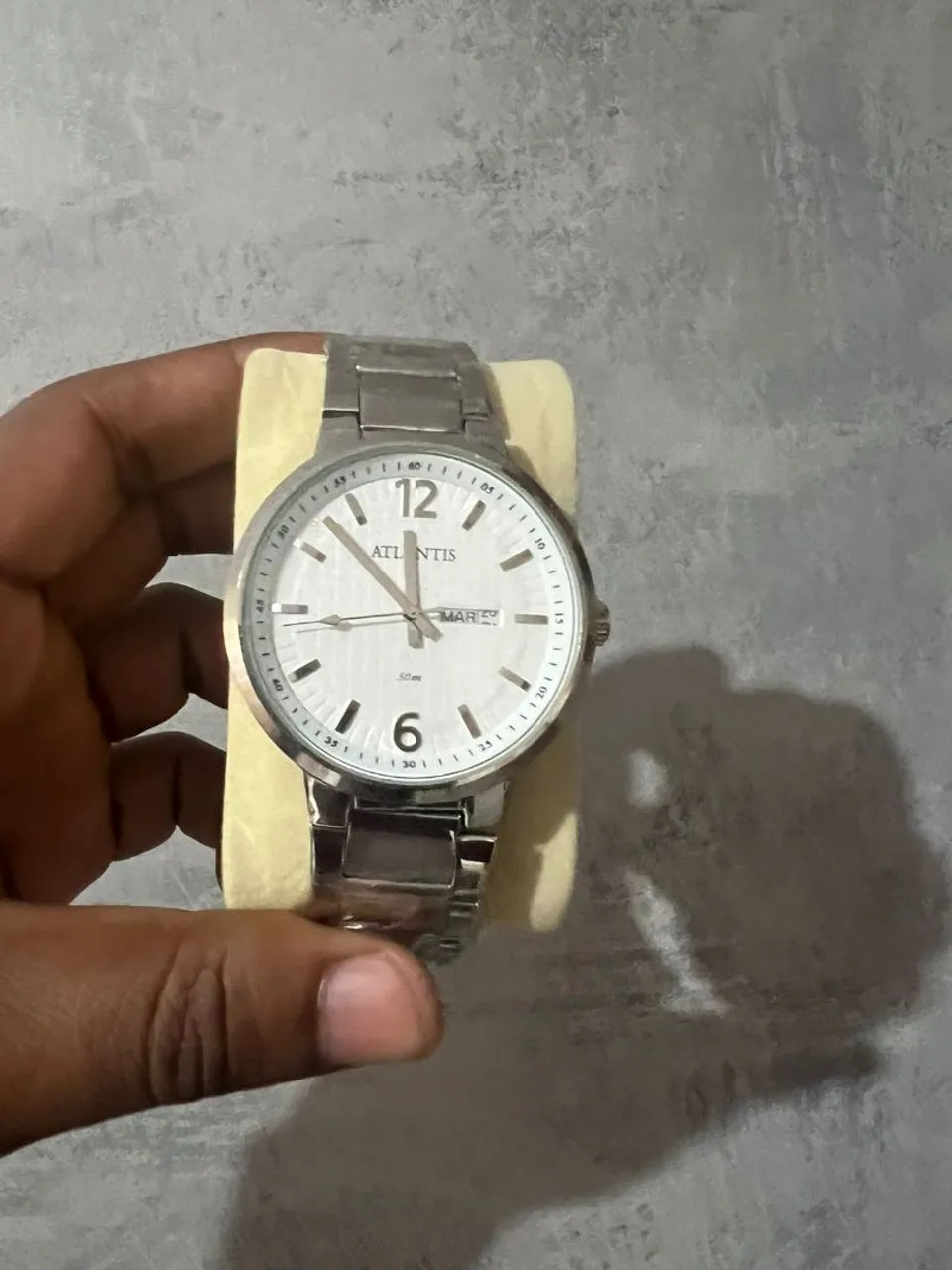 Relógio Atlantis analógico com design elegante, pulseira de metal e mostrador branco. Perfeito para uso diário.