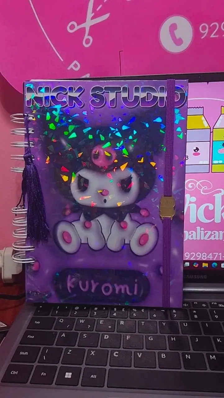 Lindo caderno da Kuromi para você arrasar na escola ou no trabalho! Com design exclusivo e detalhes encantadores, este caderno é perfeito para anotações, desenhos e muito mais.