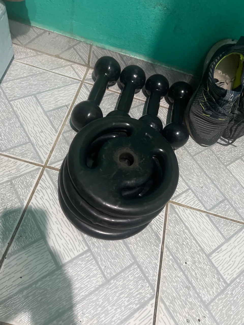 Vendo tudo 2 pares de anilhas 5kg totalizando 20kg $400,00 1 Par de Hateres 3kg $120,00 1 Par de Halteres 4kg $180,00 WhatsApp