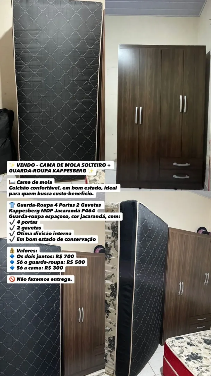 Guarda-roupa espaçoso, perfeito para organizar suas roupas com estilo. Com 4 portas e 2 gavetas, oferece amplo espaço interno e também uma cama box solteiro, aceito propostas