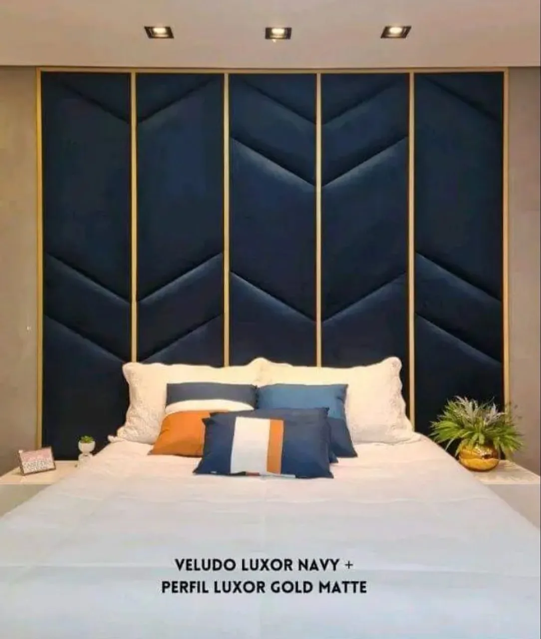 Transforme seu quarto com esta cabeceira elegante e sofisticada. Design moderno em veludo azul marinho com detalhes em dourado, proporcionando conforto e requinte ao seu lar