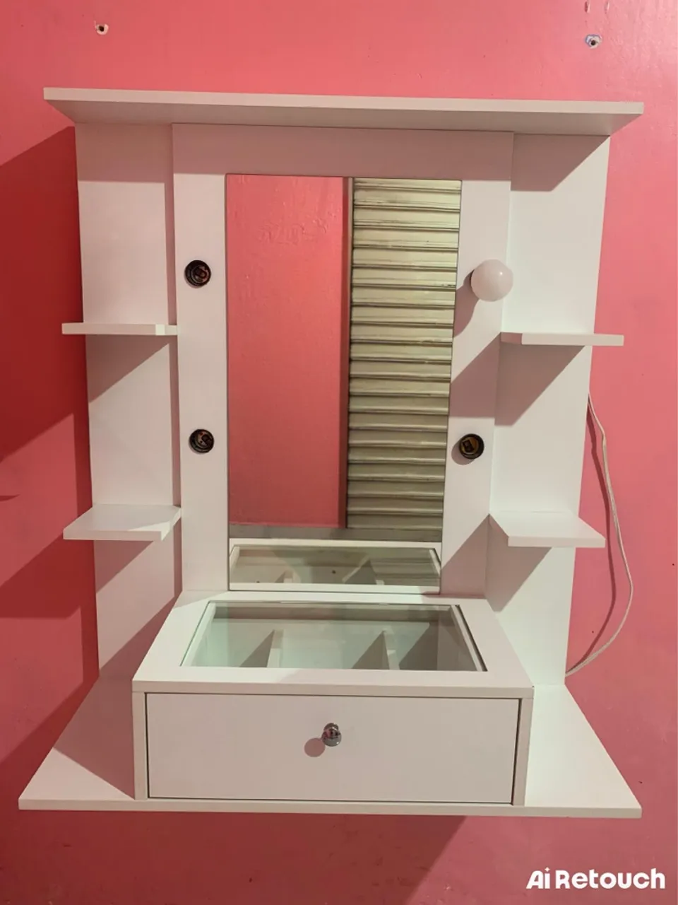 Charmosa penteadeira suspensa, ideal para otimizar espaços. Possui espelho, prateleiras e gaveta com design funcional. Perfeita para organizar seus pertences e criar um ambiente elegante.