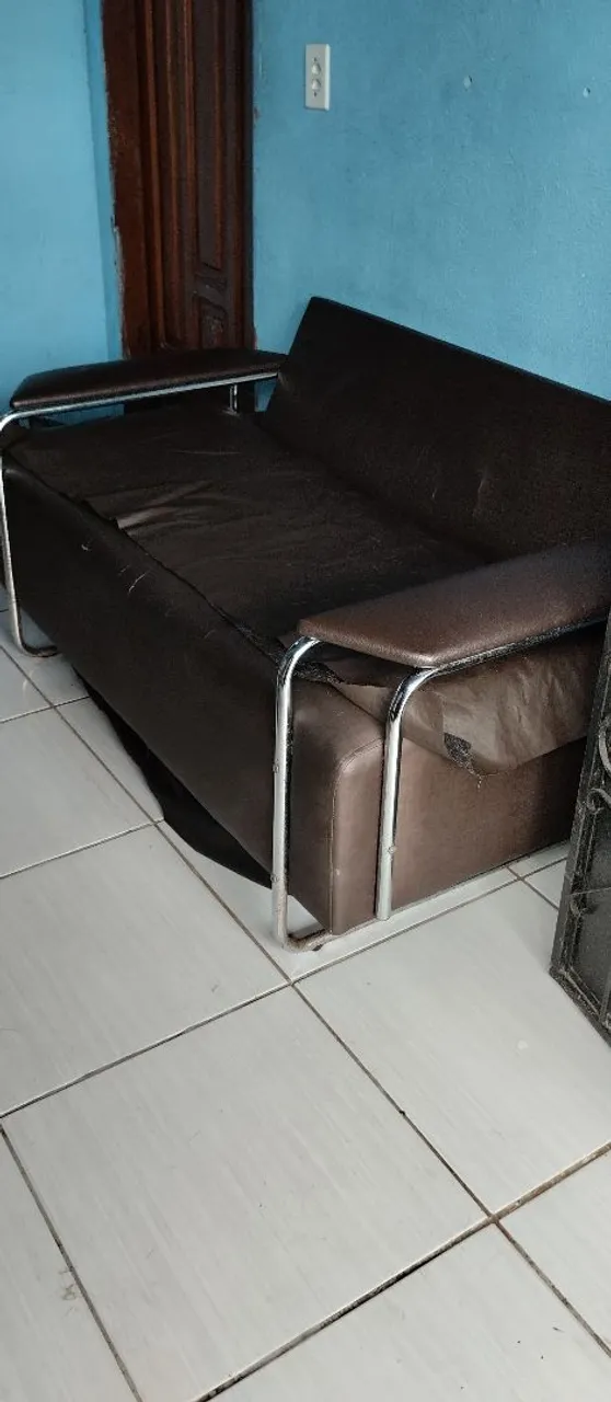 Vendo sofá estofado em courino marrom, com estrutura reforçada em metal cromado.