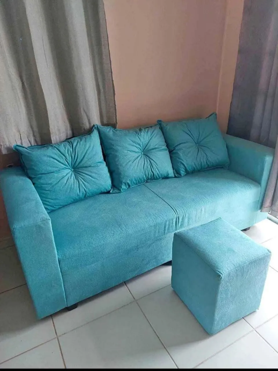 Lindo sofá azul turquesa com 3 lugares e puff, perfeito para sua sala. Conforto e estilo em um só móvel! Fazemos em várias cores 9828... ver número