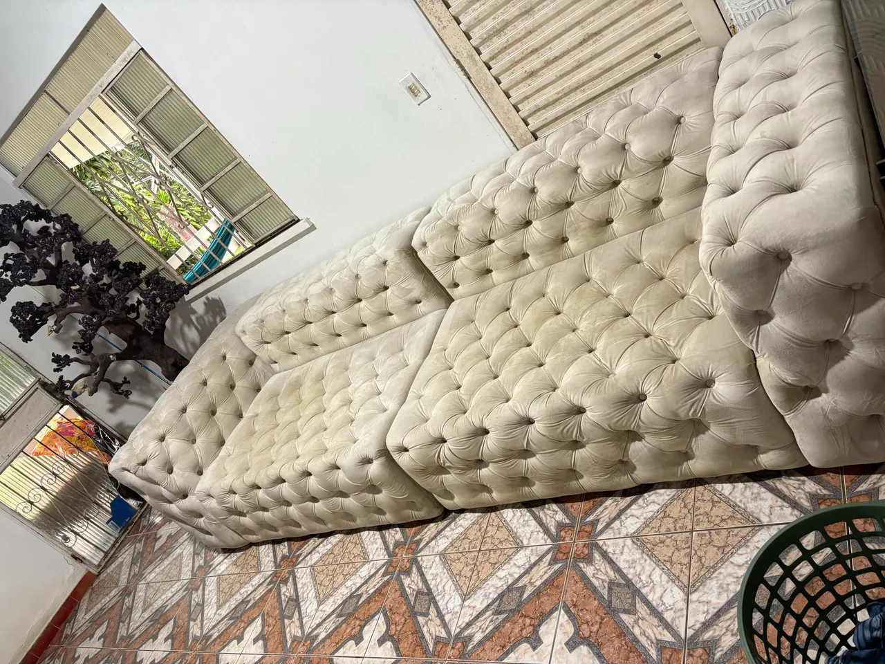 Sofá clássico e elegante grande de 3 metros com dois módulos de um 1,5 m cada. Foi fabricado sobre medida quando morávamos numa casa grande mas agora nos mudamos pra uma casa menor. Ele precisa apenas de uma higienização e temos o contato da empresa que faz e cobra 170 reais por isso. Na época pagamos 4.700 reais por ele e agora estamos vendendo por 2.000