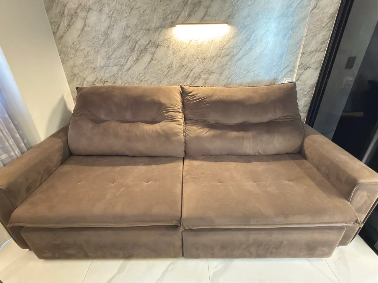 Sofá Ravena retrátil e reclinável de 2 lugares em sued marrom. 2.65 de largura. R$ 1.300. Cabe confortavelmente 4 pessoas .
