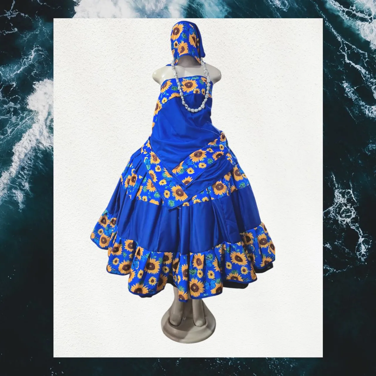Deslumbre-se com este vestido azul vibrante, adornado com girassóis que irradiam alegria e beleza. Perfeito para quem busca um visual único e cheio de charme! Roupas de Umbanda e Candomble Para uso casual e festa de luxo.