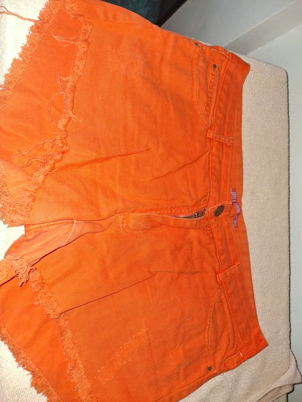 Shorts jeans laranja vibrante com detalhes modernos e acabamento desfiado. Perfeito para um look estiloso e despojado.