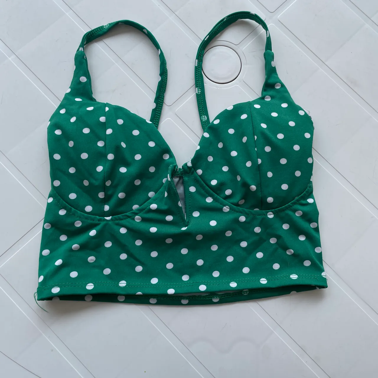 Top verde com estampa de poá, perfeito para um look moderno e estiloso. Detalhes que valorizam o seu visual! Com bojo! Tamanho M. Valor $10. Não entrego! Retirada na alvorada ou solicitar Uber entrega