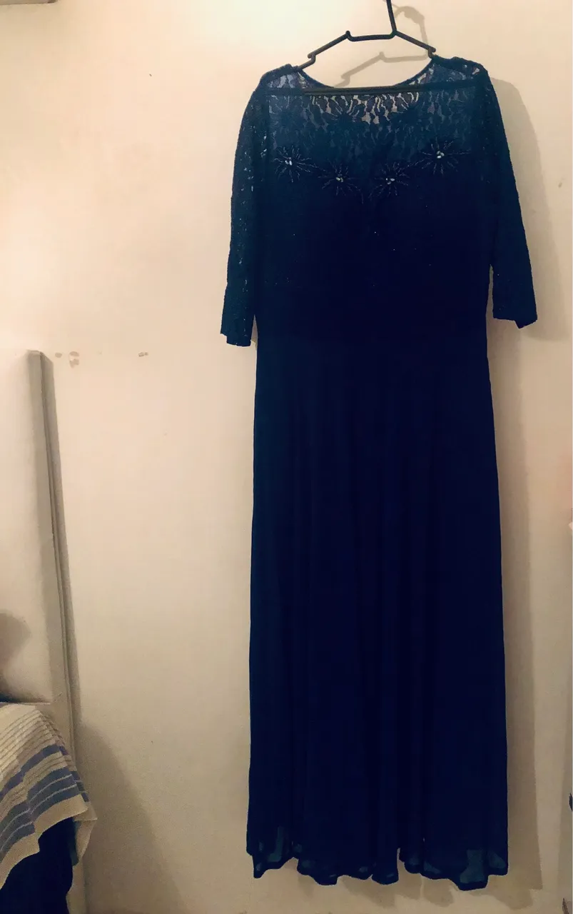 Vestido longo azul marinho, perfeito para diversas ocasiões. Detalhes em renda e um caimento elegante que valoriza a silhueta. Ideal para quem busca sofisticação e estilo!