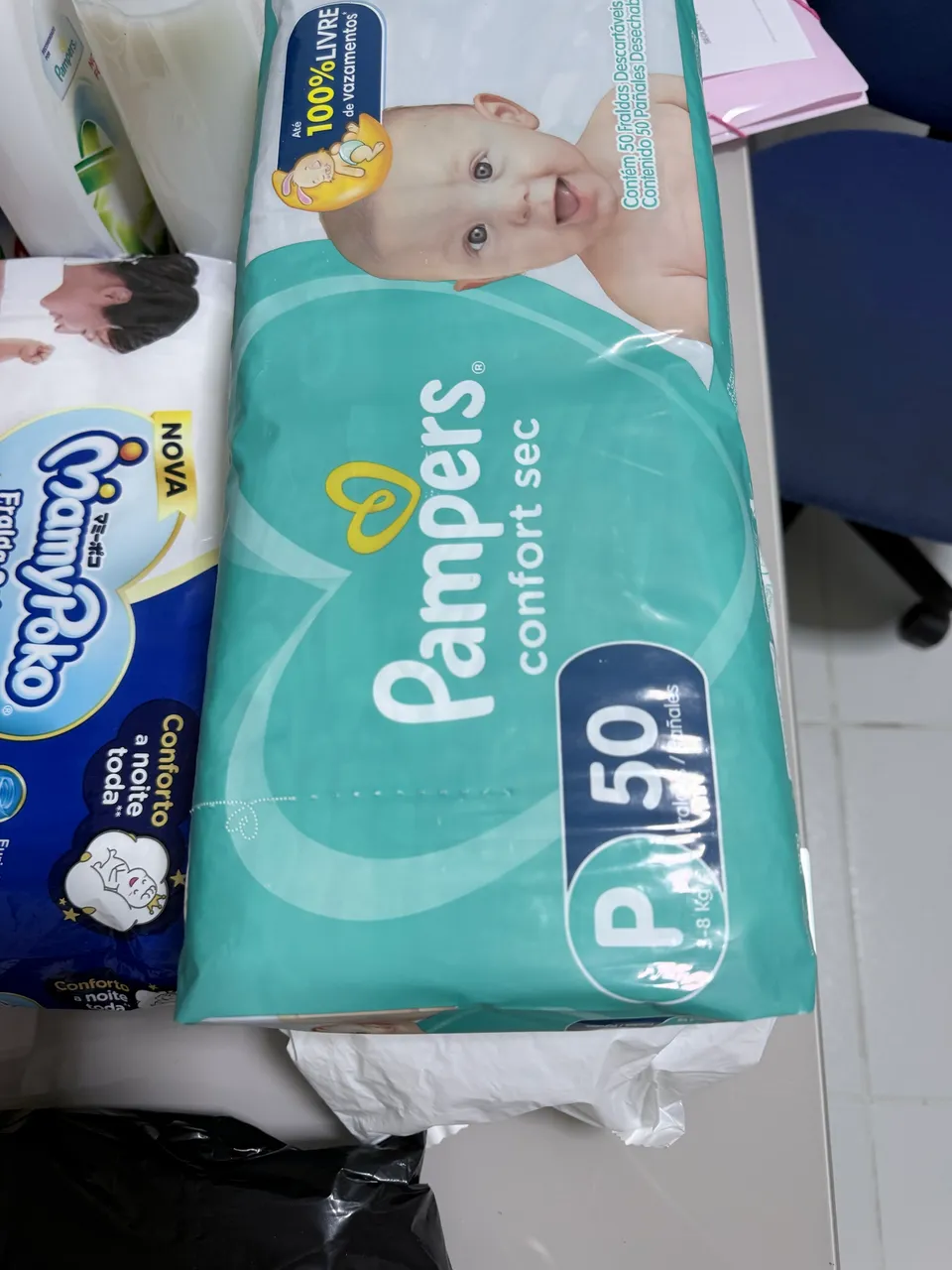 Fraldas TAM P. São 5 pacotes contendo 46 fraudas em cada pacote e um pacote de Pampers confort sec com 50 fraldas. No total de 280 fraldas P, saindo a 1 real cada fralda.
