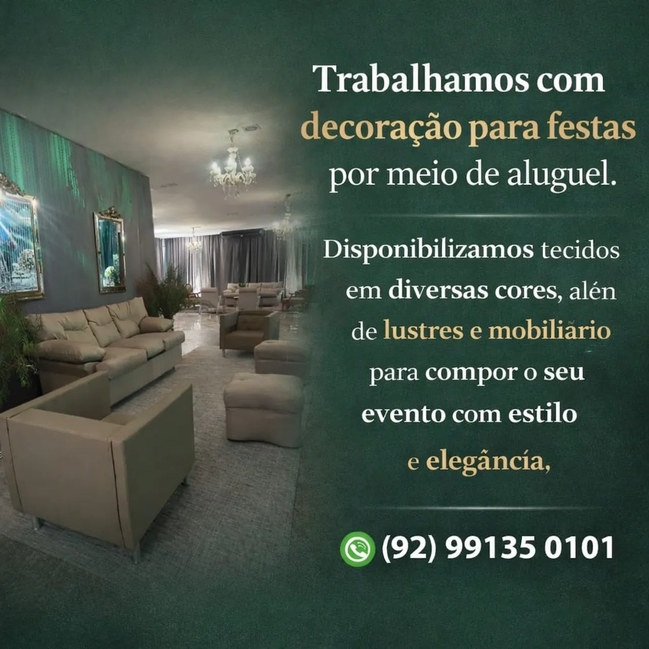 Trabalhamos com decoração para festas por meio de aluguel. Disponibilizamos tecidos em diversas cores, além de lustres e mobiliário para compor o seu evento com estilo e elegância.