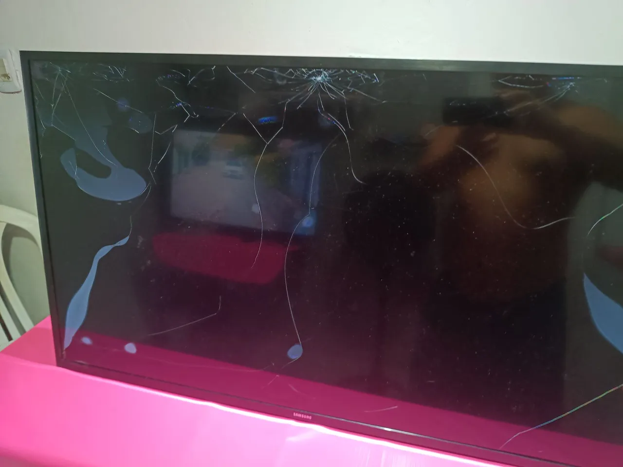 Smart TV Samsung com tela danificada. Ideal para quem busca peças ou conserto. Aproveite!